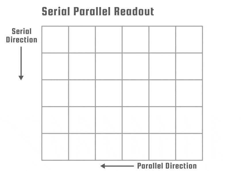 Electrons are shifted in two directions on a CCD, called the parallel or serial direction. One parallel shift occurs from the right to the left (shown at left). The serial shift is performed from top to bottom and directs the electron packets to the measurement electronics.